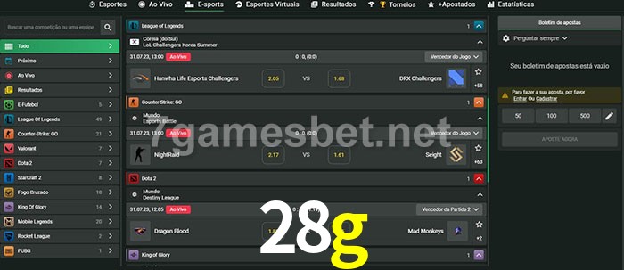 O 28g oferece uma grande seleção de opções de apostas em e-sports com probabilidades competitivas